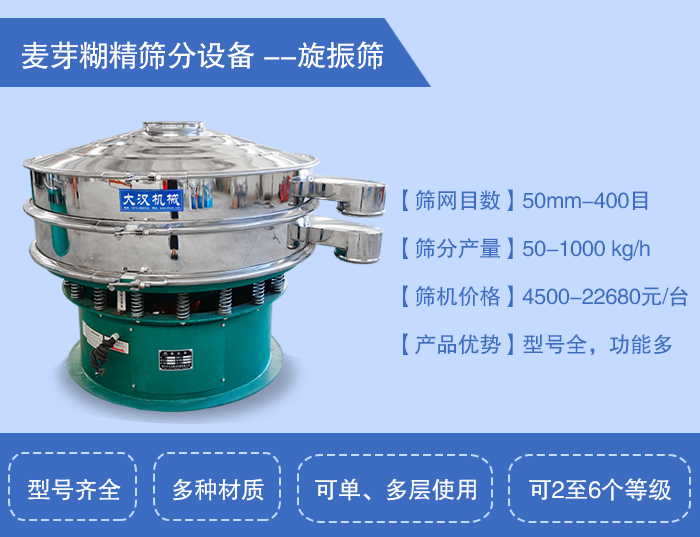 以上就是小編為大家介紹的兩款麥芽糊精振動篩(旋振篩和直排篩)希望通過小編的介紹您可以更深入的了解這兩款設(shè)備,如果您在篩機(jī)選擇上還有什么疑問,可以致電大漢機(jī)械,我們將安排專業(yè)人士為您做專業(yè)的答復(fù)~