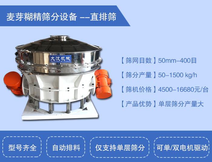 直排篩的型號與旋振篩型號相同,在層數(shù)上僅支持單層篩分,所以主要用于麥芽糊精簡單過濾和除雜,有單電機(jī)和雙電機(jī)兩種驅(qū)動方式(一般選擇雙電機(jī)形式),使麥芽糊精在篩面上產(chǎn)生渦旋運動,具有自動排料功能,可24小時連續(xù)自動化生產(chǎn);主要用于粉體生產(chǎn)線工藝流程中的粉體的除雜,篩分作用。