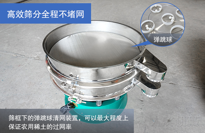 圓形振動(dòng)篩通過振動(dòng)電機(jī)上兩端的偏心塊將篩機(jī)運(yùn)動(dòng)轉(zhuǎn)化為三元運(yùn)動(dòng)對(duì)農(nóng)用稀土進(jìn)行高效篩分,再加上篩框下的彈跳球清網(wǎng)裝置,可以很大程度上保證農(nóng)用稀土的過網(wǎng)率,高效篩分全程不堵網(wǎng)。