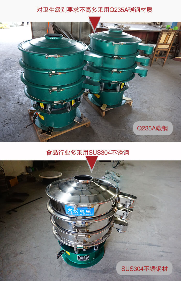 該設(shè)備整機(jī)為碳鋼材質(zhì),兩層三個(gè)出料口,機(jī)裝實(shí)心子母分離式網(wǎng)架,歸屬于常見的輕型振動篩分設(shè)備,也就三次元振動篩碳鋼振動篩,本公司生產(chǎn)的DH系列振動篩可根據(jù)客戶不同需求1-5層同時(shí)使用,產(chǎn)品型號齊全,可滿足各種粉末、顆粒篩分需要求及液體過濾需求,也可設(shè)計(jì)為超聲波振動篩粉機(jī)、氣流振動篩粉機(jī)、振動篩粉機(jī)等機(jī)型。食品行業(yè)多多采用SUS304不銹鋼,對衛(wèi)生級別要求不高多采用Q235A碳鋼作為主要材質(zhì)。