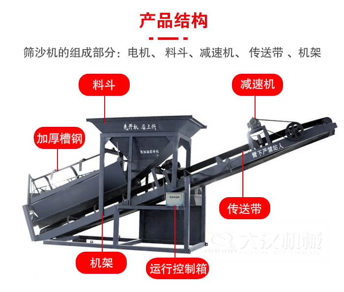 篩沙機(jī)(篩沙船)的組成部分:電機(jī)、 料斗、減速機(jī)、 傳送帶 、機(jī)架、 轉(zhuǎn)篩、 傳送桿 。