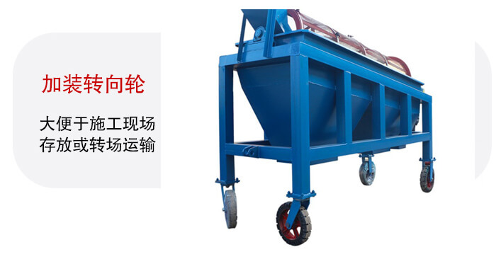 設(shè)備的整體性較高加裝轉(zhuǎn)向輪,便于施工現(xiàn)場存放或轉(zhuǎn)場運(yùn)輸,可拆卸的部件只有成品堆料皮帶機(jī),松開底部固定螺栓和吊掛鋼絲繩,將成品皮帶機(jī)塞入主框架底面即可。