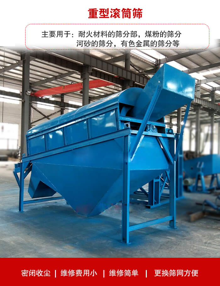 重型滾筒篩主要用于:耐火材料的篩分部,煤粉的篩分,河砂的篩分,有色金屬的篩分等。具有密閉收塵,維修費(fèi)用小,維修簡(jiǎn)單,更換篩網(wǎng)方便等特點(diǎn)根據(jù)不同用戶(hù)的篩分需求選擇:?jiǎn)螌訚L筒篩:主要分離出兩種粒度的物料。多層滾筒篩以及單層多段滾筒篩:可分離多種粒度的物料。