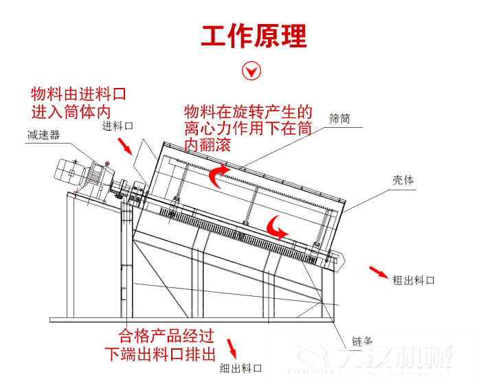 電機(jī)驅(qū)動(dòng)滾筒軸線作旋轉(zhuǎn)運(yùn)動(dòng),減速機(jī)調(diào)節(jié)筒體以一定的轉(zhuǎn)速旋轉(zhuǎn),物料由進(jìn)料口進(jìn)入筒體內(nèi),在旋轉(zhuǎn)產(chǎn)生的離心力作用下,物料在筒內(nèi)翻滾,自上而下通過(guò)分級(jí)篩網(wǎng)析出,由于篩網(wǎng)分級(jí)尺寸不同,物料逐漸被分離篩選,粒度合格的物料經(jīng)篩分后落入到各自的漏斗,然后由人力方式運(yùn)出或通過(guò)輸送機(jī)自流送往成品站。合格產(chǎn)品經(jīng)過(guò)下端出料口排出,顆粒較大,分選不合格的產(chǎn)品經(jīng)另一排料口排出,筒內(nèi)清理裝置,使篩網(wǎng)不宜被阻塞。