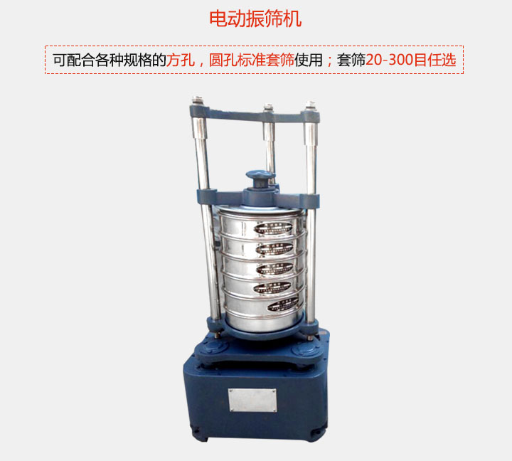 產(chǎn)品簡介:電動振篩機(jī)是實驗室中比較常用的篩分設(shè)備,該機(jī)可以配合各種規(guī)格的方孔,圓孔標(biāo)準(zhǔn)套篩進(jìn)行使用,套篩從20-300目任選。