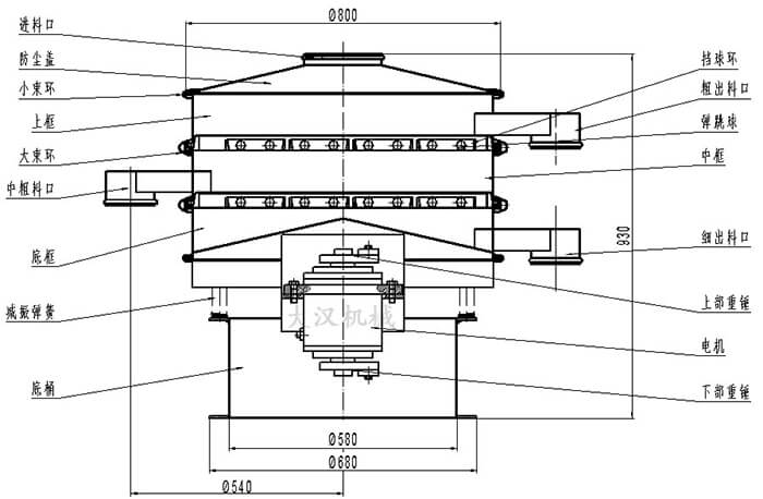 油漆除雜振動篩利用YZUL立式振動電機作為激振源,通過振動電機上下兩端的偏心重錘將旋轉(zhuǎn)運動轉(zhuǎn)變?yōu)樗?、垂直、傾斜的三次元運動,并傳遞到旋振篩的篩面上;物料通過入料口進入設(shè)備內(nèi),根據(jù)不同物料篩分要求,物料經(jīng)過1-5層采用不同目數(shù)的金屬編織篩網(wǎng)的篩分層,在這個過程中,位于各層的篩網(wǎng)下的清網(wǎng)裝置(彈跳球)通過頻率振動不斷撞擊篩網(wǎng),使篩網(wǎng)上層物料能夠順暢的透網(wǎng)篩分,并有效解決了物料堵網(wǎng)問題出現(xiàn),不同目數(shù)的物料通過各層對應(yīng)目數(shù)的篩網(wǎng)后在各層的出料口排出,從而實現(xiàn)篩選除雜或過濾分級的目的。調(diào)節(jié)上、下兩端的相位角,可以改變物料在篩面上的運動軌跡。